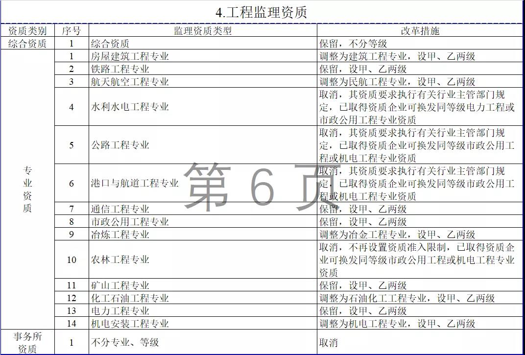 4.工程監理資質。保留綜合資質;取消專業資質中的水利水電工程、公路工程、港口與航道工程、農林工程資質,保留其余10類專業資質;取消事務所資質。綜合資質不分等級,專業資質等級壓減為甲、乙兩級。